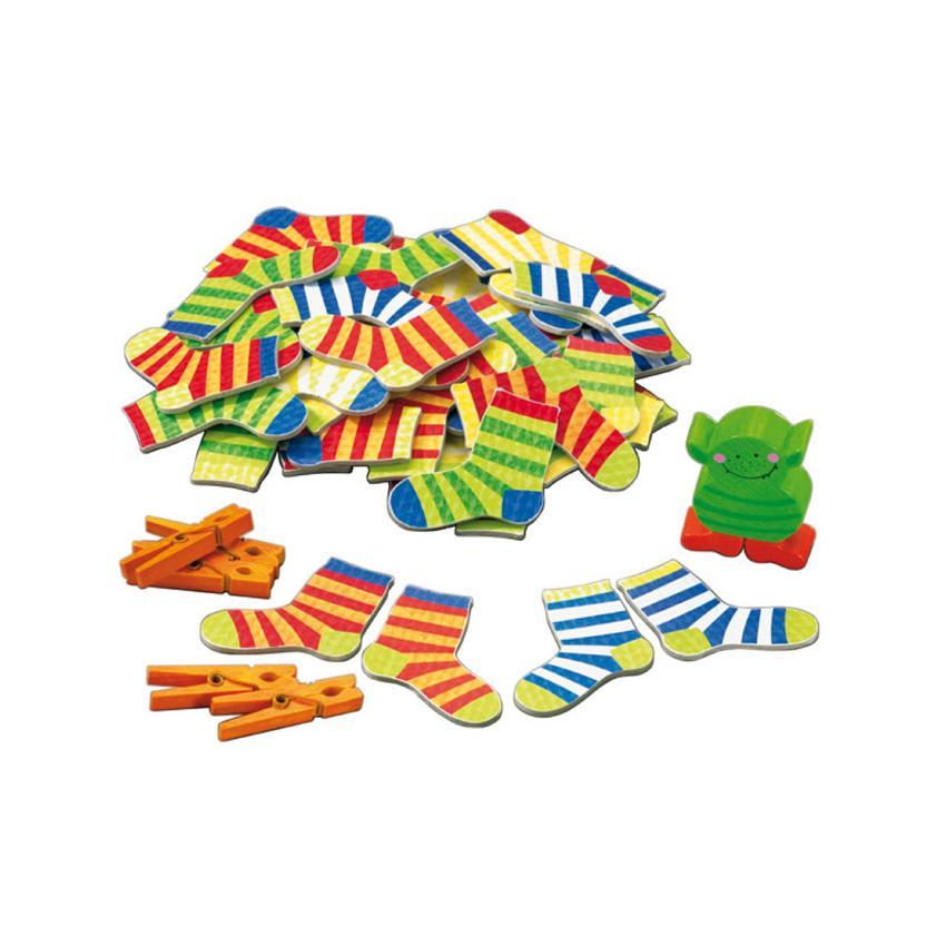 Juego infantil de mesa de asignación y reacción, en formato de cartas, para 2-6 jugadores a partir de 4 años. El descarado monstruo de los calcetines ha provocado el caos en el armario y ahora están todos los calcetines mezclados. ¿quién será capaz de emparejar más calcetines y ganar la partida?