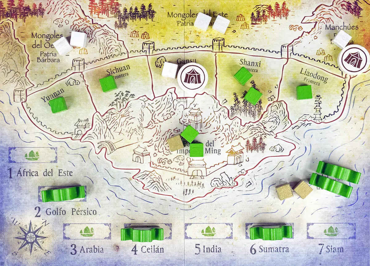 Uno de los jugadores asume el papel del Emperador Ming, que intenta completar las 7 Expediciones mientras protege sus Fronteras de las invasiones bárbaras. El otro jugador encarna el Caudillo Bárbaro, y controla las 3 facciones bárbaras que tratan de establecerse en las Fronteras de China.