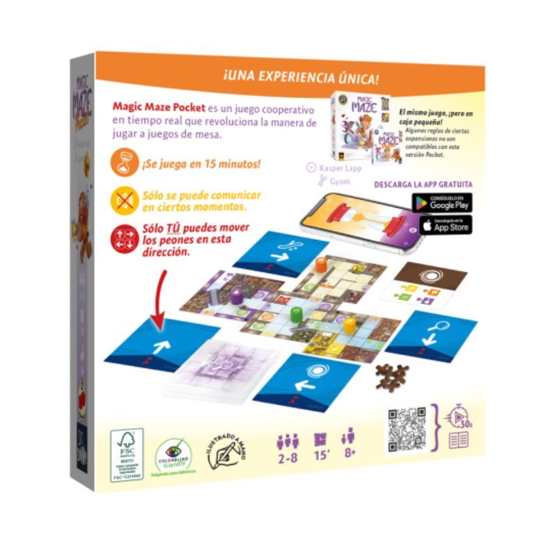 Magic Maze Pocket es la versión de bolsillo y económica de Magic Maze, ¡perfecta para llevarte la aventura a todas partes! Magic Maze Pocket es un juego cooperativo en tiempo real. Puedes controlar a cualquiera de los 4 peones héroe siempre que quieras para hacer que ese héroe realice una acción muy concreta, a la que los demás jugadores no tienen acceso: moverse hacia el norte, explorar una nueva zona, subir por una escalera mecánica... Tienes que completar tu misión antes de que se agote el reloj de arena. Además, solo se os permitirá comunicaros durante breves periodos de tiempo durante la partida. El resto del tiempo, tendréis que jugar sin daros señales visuales ni sonoras. ¡Contiene una loseta exclusiva jugable también en Magic Maze!