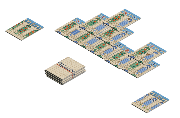 Nínive es un juego de colocación de cartas para formar una estructura compartida, siguiendo sencillas reglas de construcción.